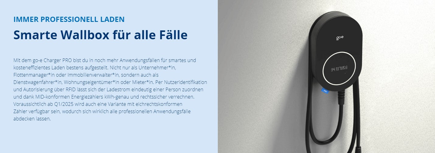 Mit dem go-e Charger PRO bist du in noch mehr Anwendungsfällen für smartes und kosteneffizientes Laden bestens aufgestellt. Nicht nur als Unternehmer*in, Flottenmanager*in oder Immobilienverwalter*in, sondern auch als Dienstwagenfahrer*in, Wohnungseigentümer*in oder Mieter*in. Per Nutzeridentifikation und Autorisierung über RFID lässt sich der Ladestrom eindeutig einer Person zuordnen und dank MID-konformen Energiezählers kWh-genau und rechtssicher verrechnen. Voraussichtlich ab Q1/2025 wird auch eine Variante mit eichrechtskonformen Zähler verfügbar sein, wodurch sich wirklich alle professionellen Anwendungsfälle abdecken lassen.